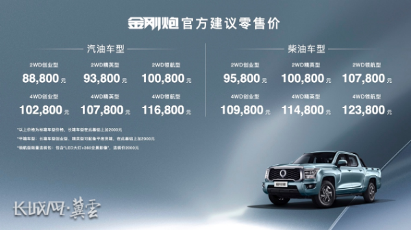 金刚炮拥有汽油、柴油两种动力,两驱、四驱多种不同版本,汽油车型8.88万元起,柴油车型9.58万元起。