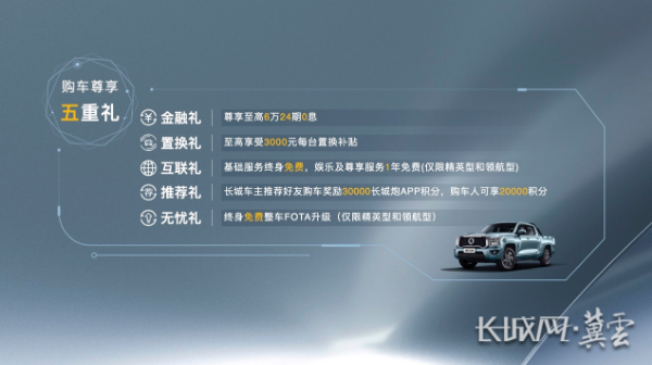 在皮卡政策方面,长城皮卡还联合中汽协、乘联会及各皮卡友商共同助推皮卡新标准出台,筹备皮卡协会成立、推进皮卡政策解禁。据统计,目前全国放宽皮卡进城限制的城市已达到70%以上。