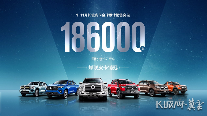 1-11月,长城皮卡全球累计销售186298台,同比增长7.8%,国内终端市占率近50%,中国每卖出两台皮卡,就有一台是长城;海外累计销售41253台,保持中国品牌出口销量领先。长城炮已累计39个月销量过万,蝉联皮卡销量冠军。作为皮卡领导者,长城皮卡已连续25年销量第一,全球累计销量突破245万,持续引领中国皮卡向上,助力中国皮卡走向世界。