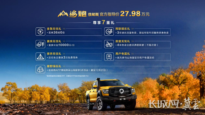 凭借穿越全场景的综合实力,长城炮全性能家族为用户带来丰富的户外生活乐趣。未来,长城炮还将持续完善产品版图,实现全阵容、全场景、全价格带覆盖,助推皮卡市场全面扩容,点燃更多人心中的皮卡梦,让中国皮卡成为世界皮卡领域的“性能符号”。