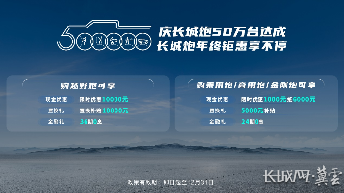 年末将至,长城炮年终钜惠重磅来袭:即日起至12月31日,购买山海炮乘用版、山海炮性能版、越野炮、乘用炮、商用炮、金刚炮、弹系列等车型,均可享受不同程度的优惠福利。