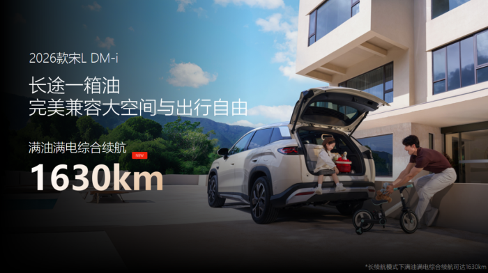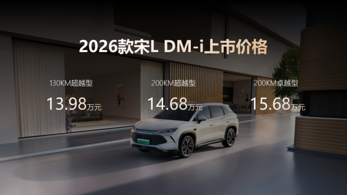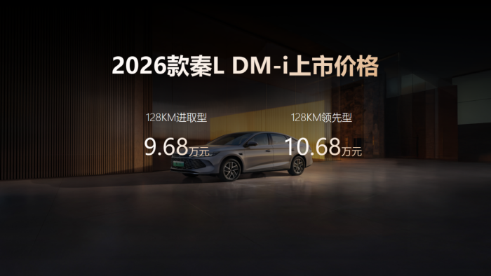 本次焕新上市的车型分别瞄准不同细分市场,第二代秦PLUS官方指导价7.98万元-9.98万元,2026款秦L DM-i官方指导价为9.68万元-10.68万元,2026款宋L DM-i官方指导价为13.98万元-15.68万元,2026款宋Pro DM-i的官方指导价为10.28万元-12.58万元。四款车以各具特色的产品魅力,满足用户从个人驾享到家庭出游的全场景需求。