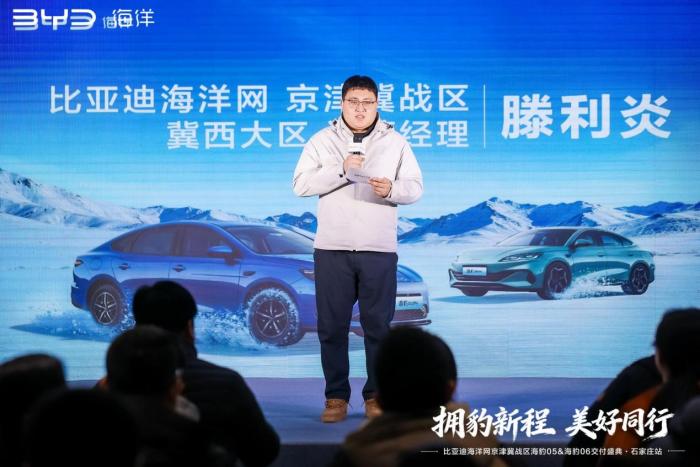 伴随着激昂的音乐,盛典正式拉开帷幕。比亚迪海洋网京津冀战区的相关领导登台致辞,他表示:“比亚迪始终以技术创新驱动绿色出行变革,海洋系列作为品牌核心产品矩阵的重要组成,始终秉持‘以用户为中心’的理念,不断迭代升级产品力。此次海豹06DM-i&海豹05DM-i在石家庄同步上市并交付,既是对当地消费者信任与支持的回馈,更是比亚迪深耕华北市场、助力区域‘双碳’目标实现的坚定践行。未来,我们将持续以优质产品与贴心服务,陪伴石家庄车主奔赴每一段美好旅程。