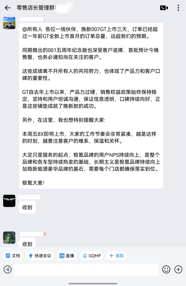 二是用户服务,不搞一时的噱头,而是为用户提供实用周到的高标准服务,并保持服务水平的连贯性、一致性。从线上邀约、用户到店、试乘试驾、跟单促单、销交融合,用户体验全流程有专属的《待氪之道-尊享体验》服务标准,从“服务同质化”向“用户获得感”转变。在全链路用户旅程中秉承“峰终定律”,在用户体验流程中植入有温度的服务触点,聚焦“一切从用户需求出发”,强化前端销售、交付与售后服务的融合,确保用户得到一致性的服务体验。