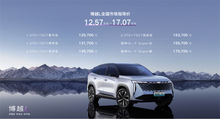 10月26日,吉利全新旗舰级车型——博越L,以XR全场景线上发布的新颖方式正式上市。新车共推出3款动力总成共计6款车型,官方指导价为12.57—17.07万元,极具竞争力的售价,给用户带来超越期待的惊喜。作为吉利的重磅战略车型,博越L汇集了CMA架构、雷神智能混动、GEEA2.0电子电气架构和NOA高阶智驾辅助系统等吉利最强造车科技。凭借好智能、好安全、好节能的硬核产品实力,博越L王者归来,为用户打造了极具科技感、仪式感、沉浸感、安全感和愉悦感的智能移动空间,成为更懂年轻人的“新三好SUV”,有望重回紧凑级SUV销量第一阵营。