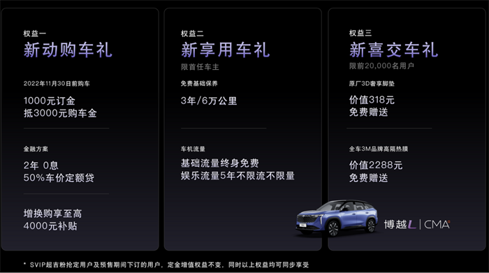 与此同时,博越L还推出了售价6000元的双色黑曜流光套装,以及3大权益7重购车礼。SVIP“超吉宠粉”抢定用户及预售期间下订的用户,除定金增值权益外,可同步享受以下权益。