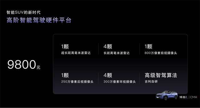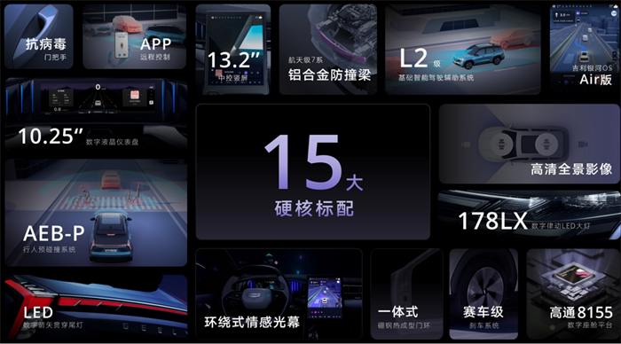 值得一提的是,博越L全系实现了15大硬核标配,让更多用户共享吉利技术进步的红利。包括:高通8155芯片、ACC自适应巡航+LKA车道保持等L2级基础智能驾驶辅助系统、数字箭矢LED贯穿尾灯、环绕式情感光幕、178LX数字律动LED大灯、13.2英寸中控竖屏、银河OS Air版、10.25英寸数字液晶仪表、高清全景影像、抗病毒门把手,AEB-P行人预碰撞系统、赛车级刹车系统、航天级7系铝合金防撞梁、一体式硼钢热成型门环以及手机APP远程控制。其中,像高通8155芯片等配置,均是许多豪华品牌需要额外付费选装或高配版型才有的配置。而博越L实现了全系标配,让用户体验一步到位。