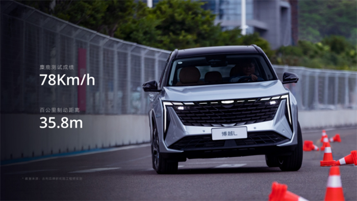 受益于中欧联合专业底盘调校、190mm长行程SN阀系减震器、DP-EPS双小齿轮式电动助力转向系统和VDDM车辆动态控制系统等顶级硬件配置的赋能,博越L的麋鹿测试成绩可达78km/h, 100km/h~0制动距离仅为35.8m,0~100km/h加速时间仅为7.4s,机械素质媲美高价值豪华品牌,驾控安全性能堪称赛道级表现。