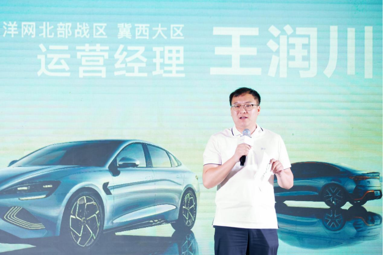 活动现场,比亚迪汽车海洋网北部战区冀西大区运营经理王润川先生发表致辞,与大家分享了比亚迪在技术、产品和市场上的全面爆发,以及海豹冠军版的升级焕新。