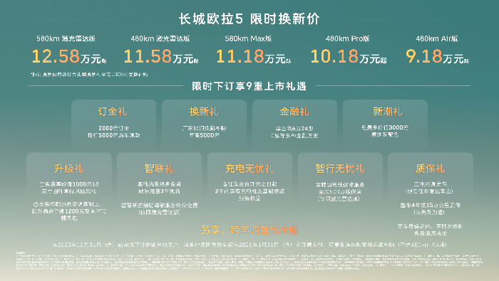2025年12月16日——今日,长城汽车欧拉品牌全新A级纯电SUV——长城欧拉5正式上市。新车共推出5款配置,建议零售价区间为 9.98万至13.38万元,限时换新价9.18万元起(限时换新价包含“订金礼”和“换新礼”至高5000元以旧换新补贴)。为回馈广大用户的热爱与支持,即日起至2025年12月31日,用户下订并锁单即可尊享包含订金礼、换新礼、智行无忧礼在内的9重上市好礼,以及跨年购置税补贴(不含480km Air版)等丰厚购车权益。凭借诚意十足的价格权益与越级产品力,长城欧拉5致力于成为全球年轻用户的“严选搭子”。