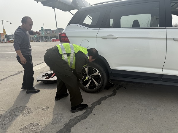 4月14日下午3时许,一辆冀F牌照的白色轿车在京石高速定兴收费站缴费完毕后,车辆行驶状态出现异常,车身明显倾斜,司机连忙将车停靠在收费站外广场的安全地带,下车查看后发现右后轮已经完全干瘪,无法继续行驶。面对突发状况,司机显得手足无措,神情焦急。正在广场巡查的工作人员发现情况后,立即上前询问。得知是轮胎被异物扎破漏气,而车主既不会更换备胎,也没有携带相关工具,正焦急地不知如何是好。