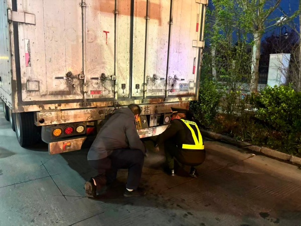 在等待救援的一个多小时里,邢毅始终没有离开现场。为了尽可能缩短处置时间,他主动蹲在货车车尾,与司机一同仔细检查车辆状况,反复排查故障原因。深夜气温偏低,他还贴心为司机递上热水,暖心陪伴缓解对方的焦虑情绪。