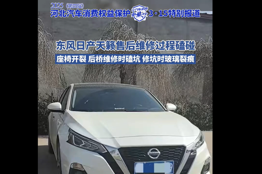 2025(第四届)河北汽车消费权益保护3·15特别报道③东风日产天籁售后维修过程磕碰,座椅开裂,后桥维修时磕坑,修坑时玻璃裂痕
